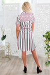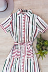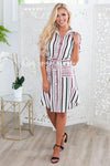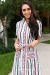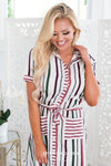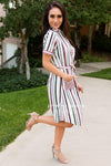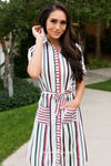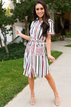 This classy yet adorable shirt dress has stolen our hearts! We love the multi color stripes, short sleeves, collard neckline and functional button front! Also, loving the belt tie waist and front pockets, get yours today before they are gone!