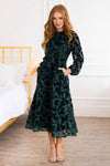 The Zarina is all class! This lovely feminine dress has stolen our hearts and the show as you can easily see! Features include, gorgeous raised black and green atop a stunning emerald lining, long sleeves, pockets and zipper back closure. Get yours before these gems are gone for good!