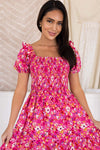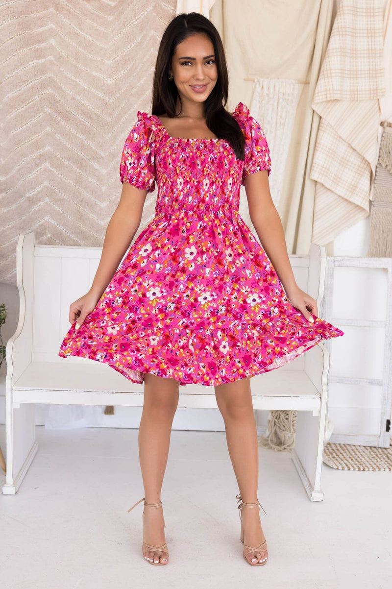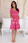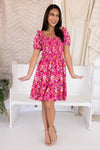 Add a pop of color and cuteness to your wardrobe with our new Zaza Dress! This adorable dress features ruffle trim short sleeves, pockets, a flattering smocked bodice and adorable tiered skirt.