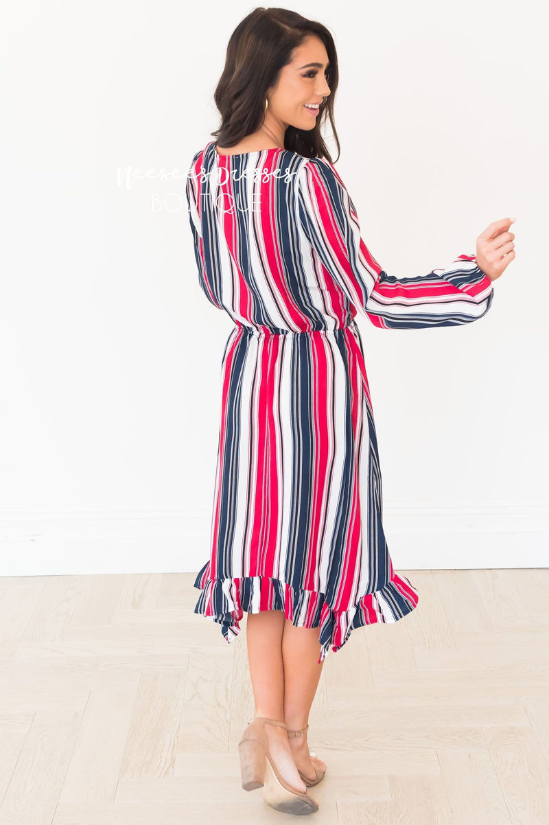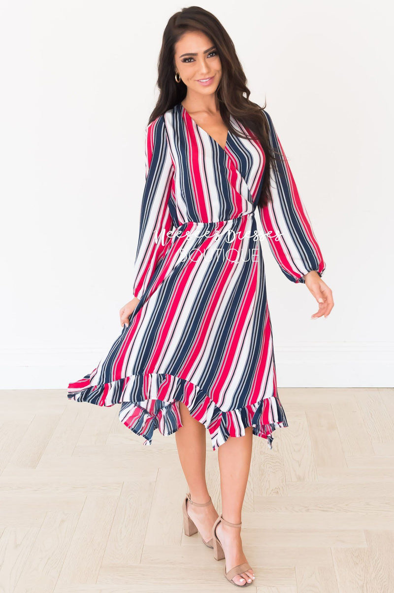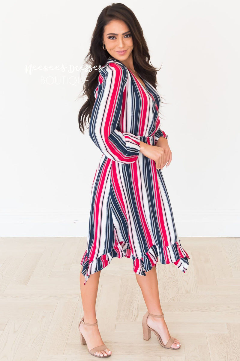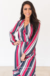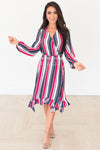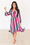 The Zila is the perfect little striped dress! We can not get enough of this classy little cutie! Featuring a crossover bodice with button closure, long sleeves, elastic waist and adorably unique ruffle hemline.