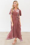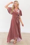 The Zillah is here and ready for any evet you have coming up! The fabulous velvet gown is stunning in everyway! This design features a classy tie waist, a hidden bodice button for a modest cross bodice fit, and absolutely radiant bell sleeves with ruched detailing! The maxi wrap skirt is pure bliss and elegance to finish this look off!
