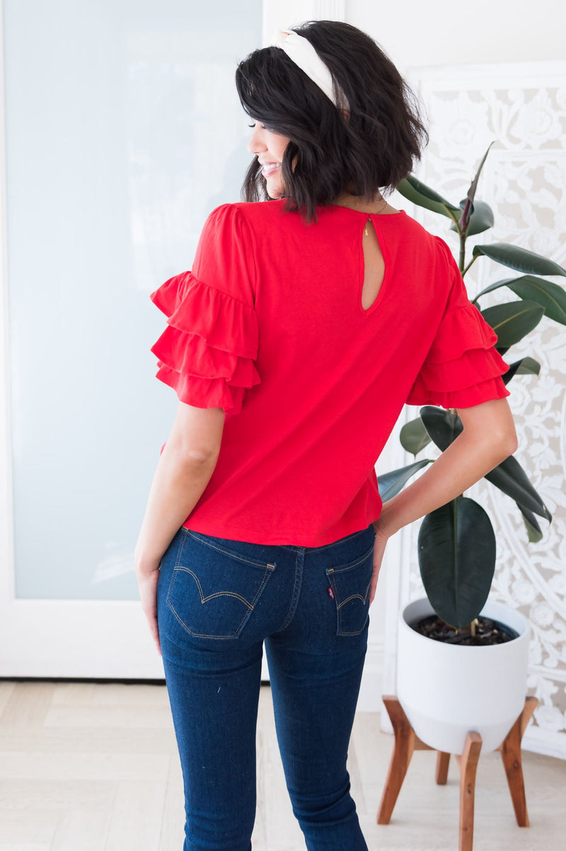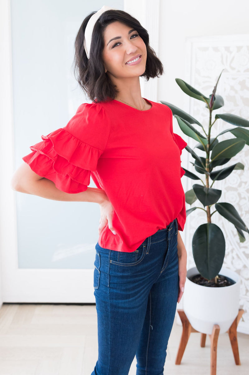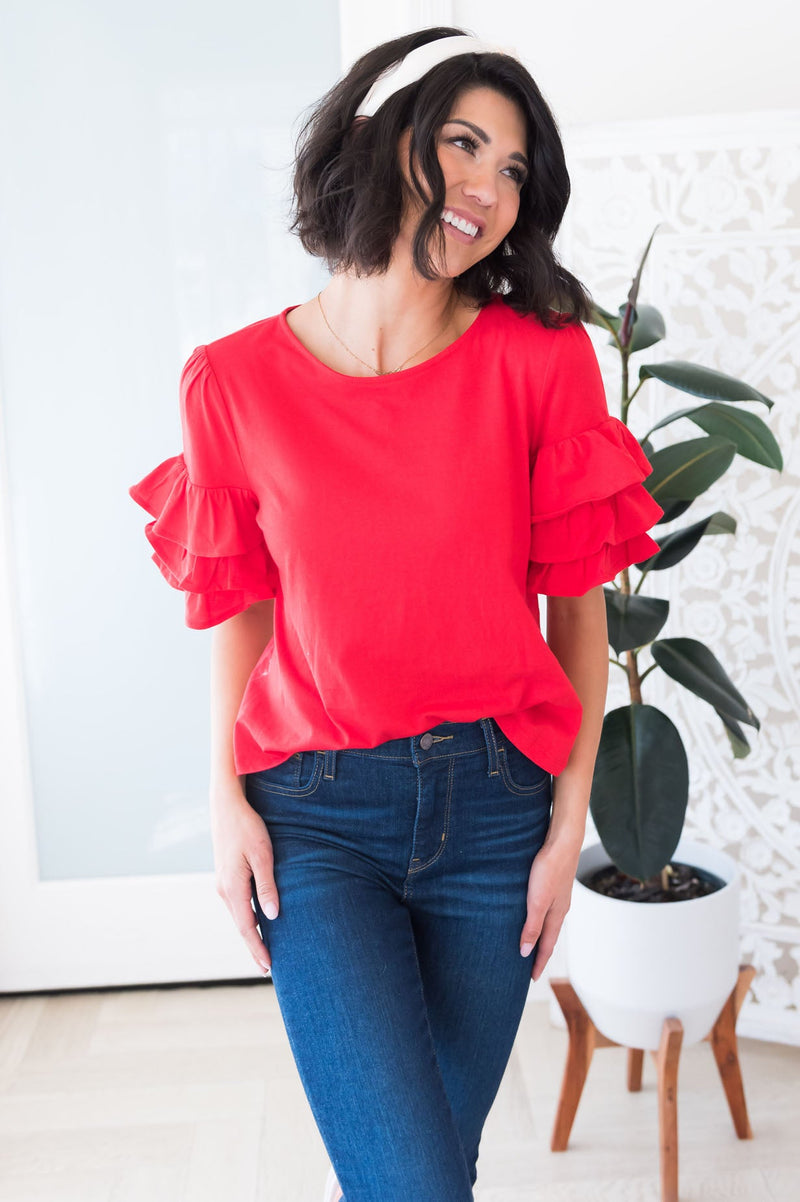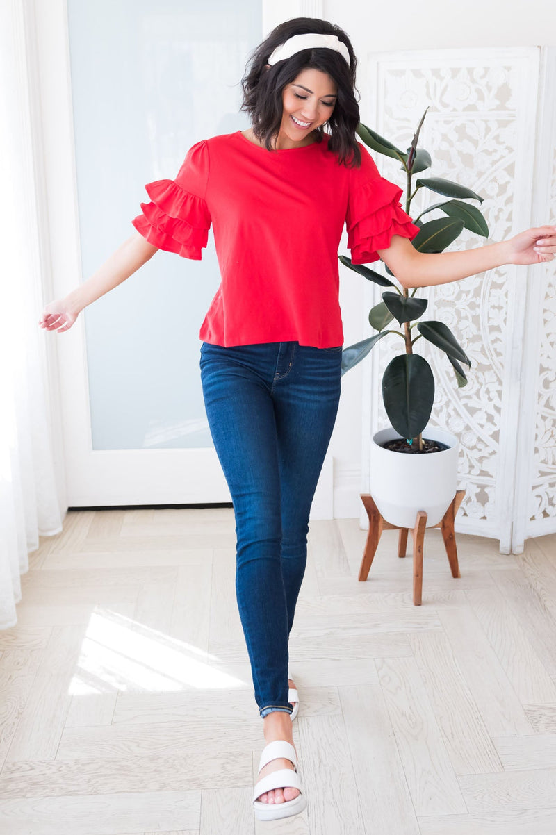 If you have been on the search for the perfect top to pair with any and every thing? Features round neck line, classy double ruffled flutter sleeves, so flowy! We are happy to share, your search is over, get the Time To Celebrate Modest top today to pair and layer your heart out!
