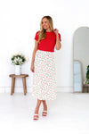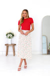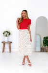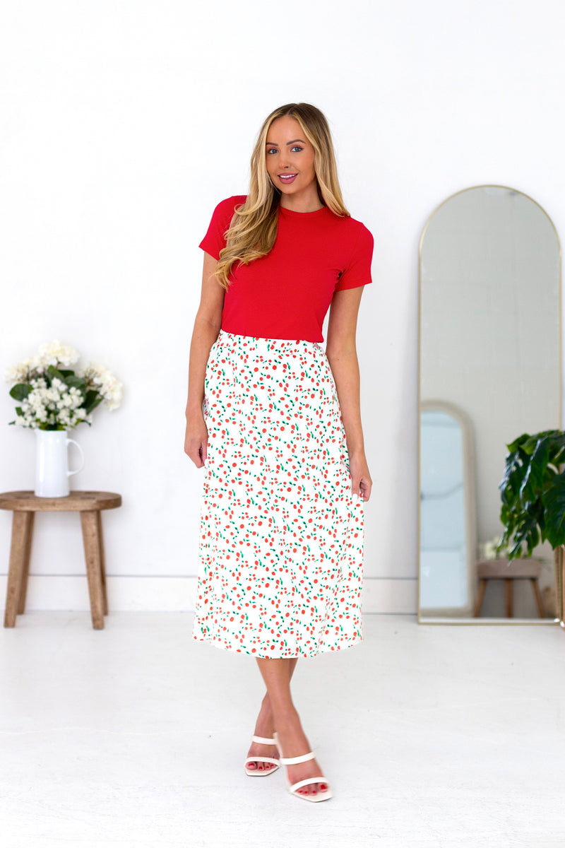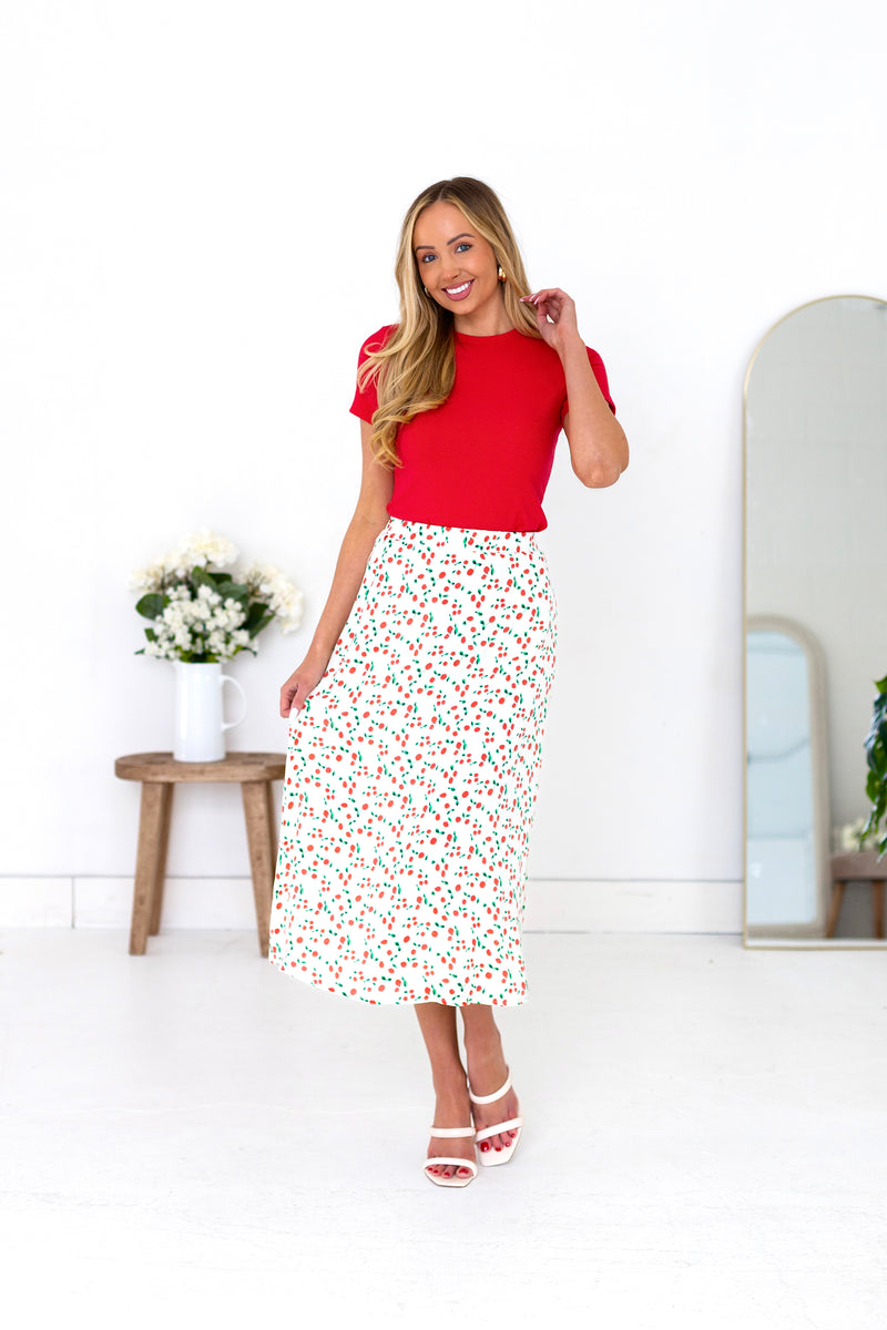 This gorgeous cherry print skirt is a closet must-have! The print and fit is absolutely stunning and the perfect combination for everyone. All your favorite tops will look amazing paired with this beauty. This darling has flattering textured fabric with an a-line fit and an elastic waistline. Get yours today!