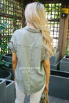 This light weight chambray top features a v neck line, a pleated front detail, dolman style sleeves, button back detail, and an over sized fit.