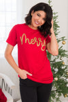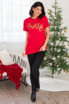 We've got your new favorite tee! Featuring unbelievably soft material, the cutest gold merry graphic around and short sleeves. This is your new modest feminine t-shirt go to for the holidays! Get yours today!