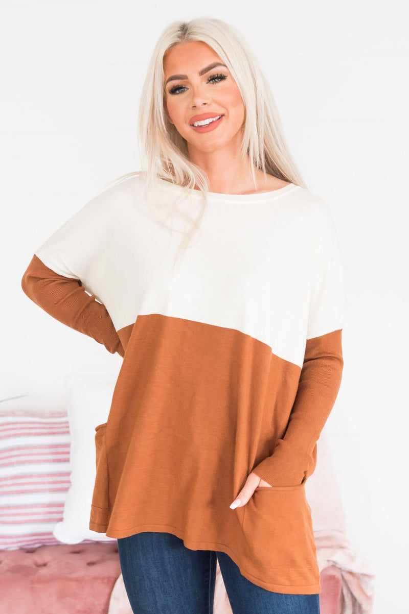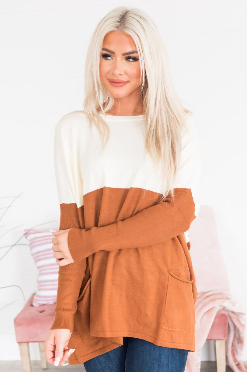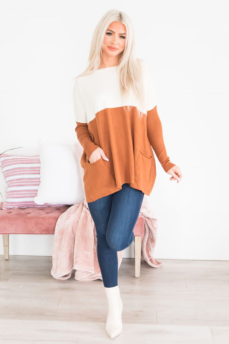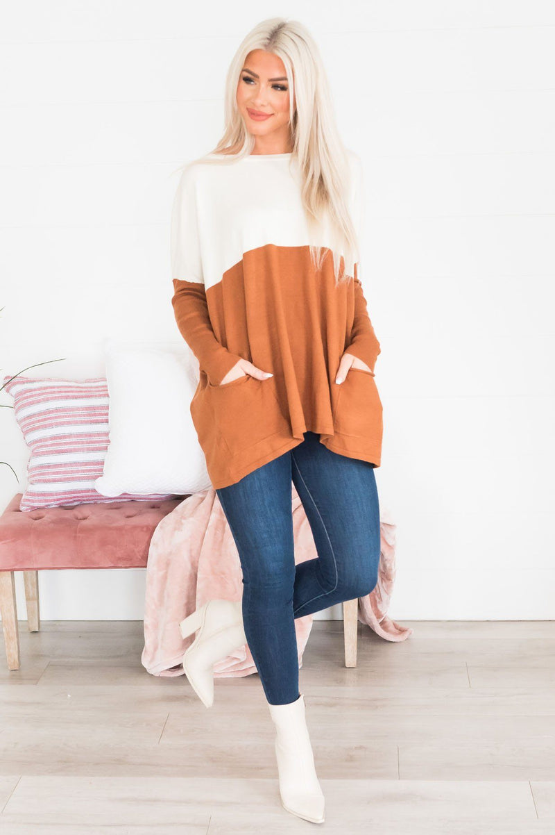 We simply can not stop obsessing over how beautiful this oversized sweater is! We adore the ivory and ginger color, big pockets, long sleeves, and rounded neckline! Move fast, these beauties won't last!