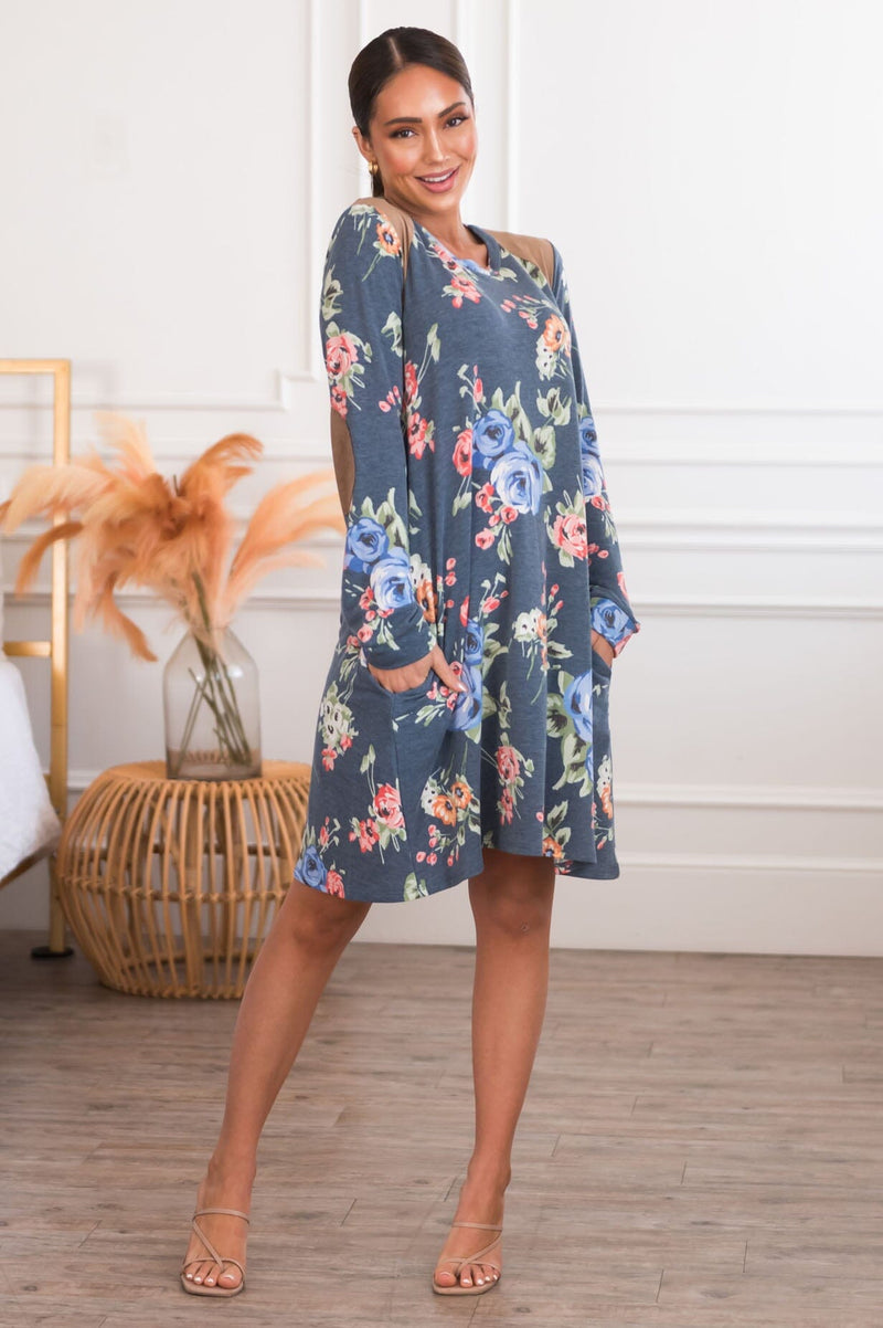 To say we are in love with this dress would be an understatement! This heather blue floral tunic dress is seriously adorable! It features a round neckline with the most darling faux suede should detailing, long sleeves with that same darling faux suede elbow patches, plus the comfiest and softest material EVER! Run, don't walk, these will not be in stock for long!