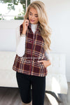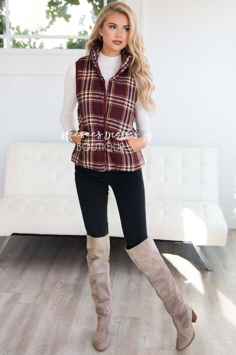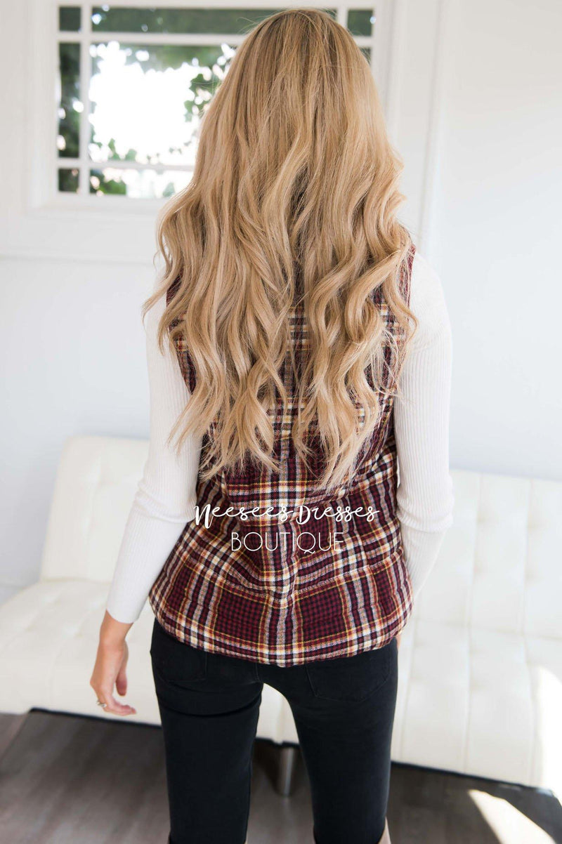 This beautifully cozy vest is made for afternoon snowball fights or hunting for the perfect Christmas tree! This vest is sure to keep you stylish and warm for any winter occasion. Burgundy vest features a white and amber plaid with a thicker cozy exterior material, a rounded collar, front zipper, side pockets and a sleek inside lining.