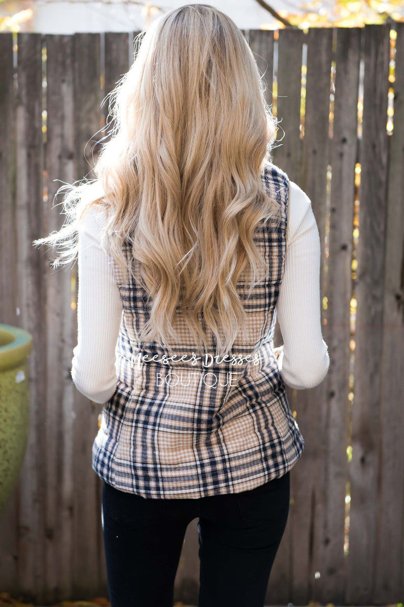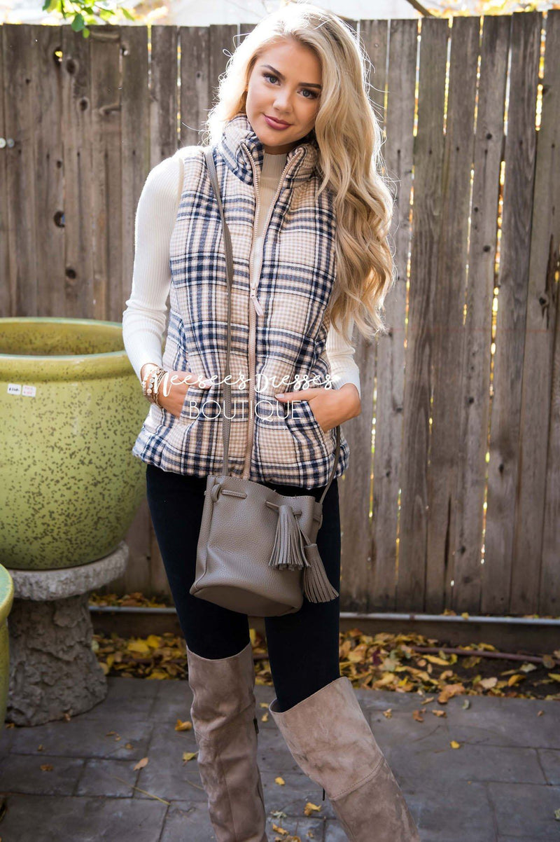 This beautifully cozy vest is made for afternoon snowball fights or hunting for the perfect Christmas tree! This vest is sure to keep you stylish and warm for any winter occasion. Taupe vest features a white and navy plaid with a thicker cozy exterior material, a rounded collar, front zipper, side pockets and a sleek inside lining.