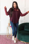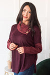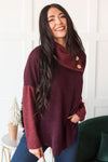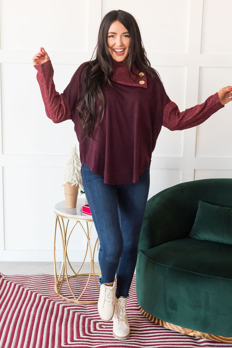 This absolutely adorable cowl neck sweater is here and is so perfect for all seasons! The lightweight material and modest design is beyond perfect! It is oh so soft and comfortable, has long sleeves, a burgundy color, and a fold over mock turtleneck with big button details! So cute! Get yours soon!